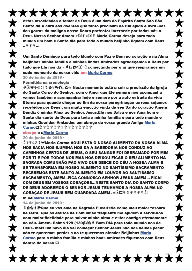 🙏💗😘🎁💐Missão cumprida 🙏escada subida🙏 a Porta se vai abrir🙏 Deus para mim vai sorrir 🙏de Alegria e sua Querida Mãe Santa Maria 🙏 me vão mostrar as Flores que eu na vida terrena para o Jardim Santo enviei algum joio Deus o arrancou🙏🙏 e assim o jardim perfumou🙏 com todo o seu Amor na vida terrena me ajudou me defendeu de muitos perigos 🙏todos eles não estão esquecidos 🙏mas eu com as minhas mãos🙏 em crus🙏 imploro ó meu Bom Jesus🙏 que sempre ajude toda a minha Família minhas Amigas e meus Amigos todos lhe pertencemos Senhor Jesus do Ceu envia para todos nós a tua preciosa Estrela para nos conduzir para os caminhos da nossa Salvação das nossa faltas te pedimos perdão faz-nos companhia Noite e Dia e a tua Querida Mãe Santa Maria Amem🙏 meu Deus 😘recebe um Beijinho😘 de todos os Filhos teus 😘Amem obrigada por o que me inspirar tudo quanto eu aqui escrevi Meu Deus não nos deixes perder precisamos da tua companhia Noite e Dia🙏💓para que um dia no Ceu contigo eternamente viver Amem tua Filha Maria Carmo🙏😘😘💓🌷🙏Feliz Natal com Alegria e com as prendas vindas do Ceu enviadas por o Menino Jesus e sua Mãe Maria Santíssima Amem😘💗🙏🎼